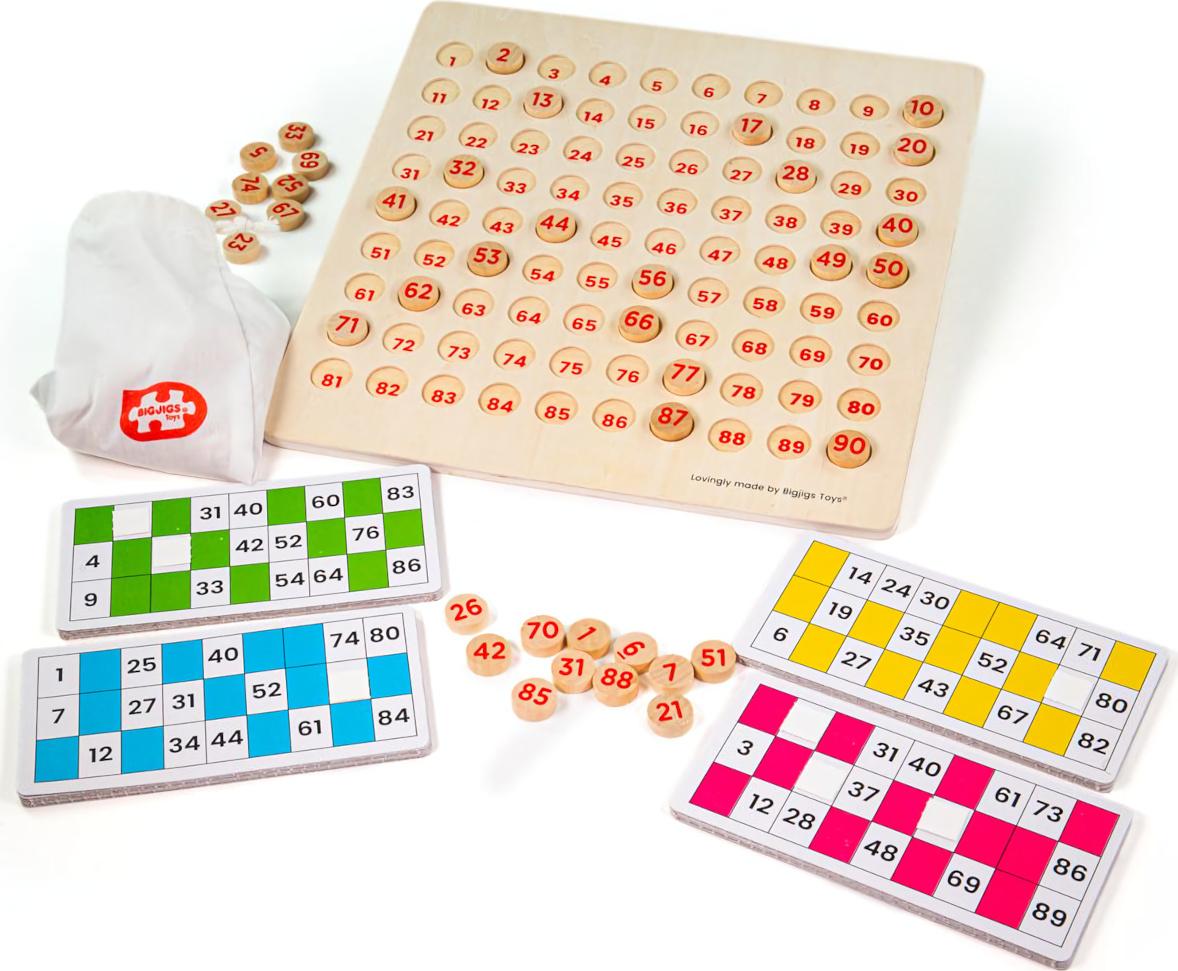 Hledáte čím vyplnit sychravá odpoledne, nebo dlouhé zimní večery? Vyzkoušejte tradiční zábavu pro hráče všech věkových kategorií, Bingo. Děti mohou při této napínavé hře trénovat užitečné rozpoznávání dvouciferných čísel. Losujte postupně z látkového sáčku dřevěné žetony a na nich uvedená čísla vyvolávejte, po vyvolání žetony odkládejte a vyplňujte jimi dřevěnou tabulku. Jednotliví hráči jsou vybaveni každý jednou, nebo i více kartami, pokud si je mohli například za herní měnu nakoupit, a zvýšit tak své šance na vítězství. Na svých kartách pak hledají shodu s vyvolanými čísly a taková políčka postupně zakrývají, dokud se někomu nepodaří zakrýt celou kartu a vyvolat „bingo!“. Díky odkládací tabulce můžete výherce velmi snadno a rychle ověřit kontrolou jeho vítězné karty. Pro přehlednost jsou herní karty vyvedeny ve čtyřech barvách, pro čtyři dětské hráče, do hry se jich však může zapojit i větší počet. Všechny součásti byly vyrobeny z vysoce kvalitních a zodpovědně získaných materiálů.   Hlavní vlastnosti:látkový sáček, odkládací deska, 99 hracích žetonů, herní karty (ve 4 barvách)pro 2–4 nebo i více hráčůatraktivní dřevěné zpracování