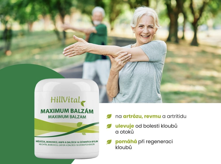 Maximum balzám je silný přírodní balzám, který přispívá ke zmírnění revmatických potíží, artrózy, osteoporózy. Speciální složení z 19 přírodních bylin doplněných o vitamíny, pomáhá regenerovat poškozené chrupavky, zmírňuje bolest a tak přispívá k zlepšení kvality života. Vhodná kombinace přírodních bylin pomáhá zmírnit bolest, zánět, otok a pomáhá také regenerovat poškozenou tkáň. Číst více...