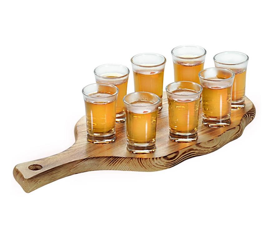 Dřevěný nosič ve tvaru prkénka s osmi panáky udělá skvělý dojem na Vaše hosty během večírku nebo oslavy.