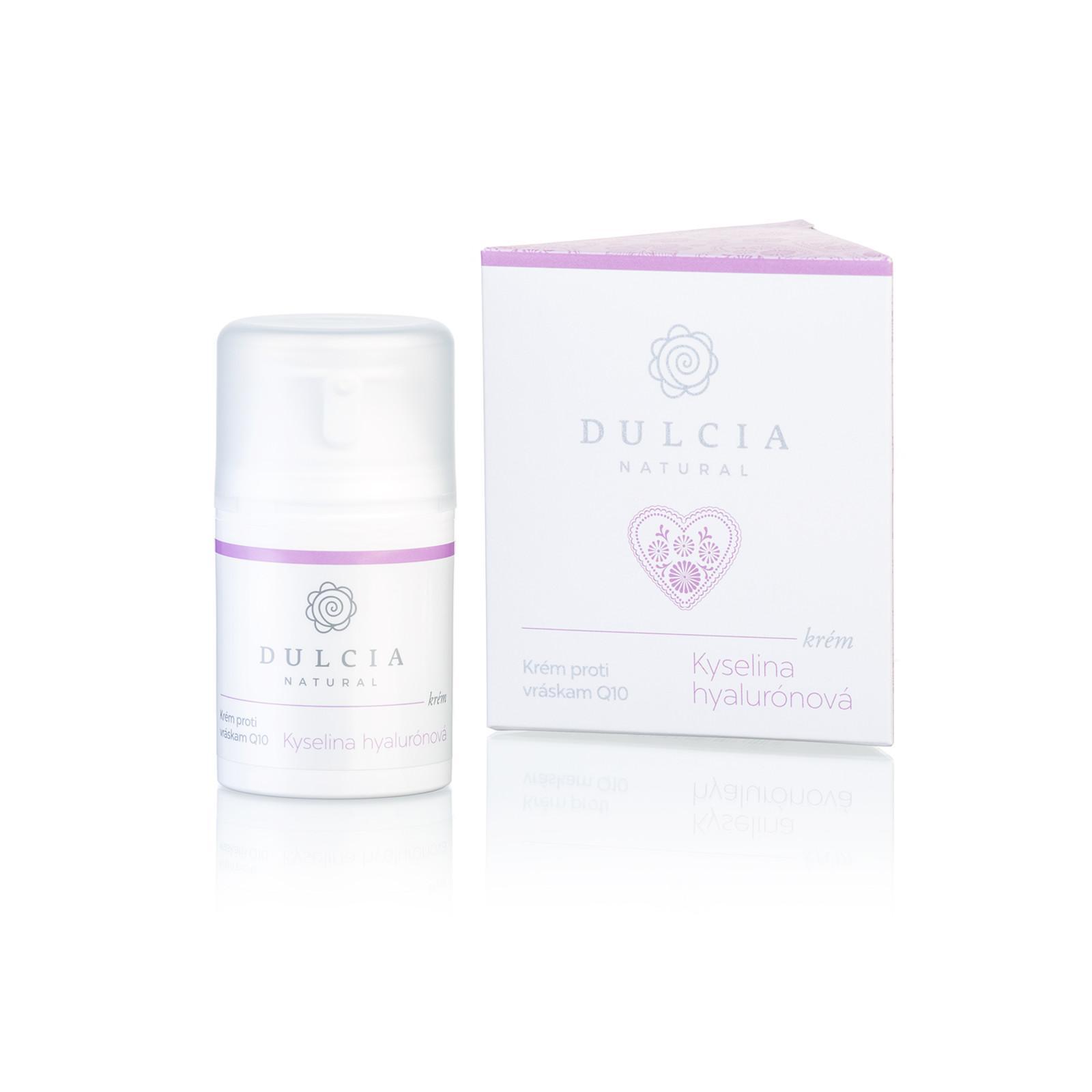 Krém proti vráskam s kyselinou hyaluronovou a Q10 DULCIA natural, který je bohatý na antioxidanty, podporuje prokrvení pokožky a zlepšuje elasticitu pleti. Je vhodný pro všechny typy pleti. Složení krému obnovuje buněčnou strukturu pokožky, chrání ji před nepříznivými účinky vnějšího prostředí a pomáhá redukovat pigmentové skvrny. Navíc také reguluje tvorbu kožního mazu a zároveň suchou pokožku hydratuje a vyživuje.