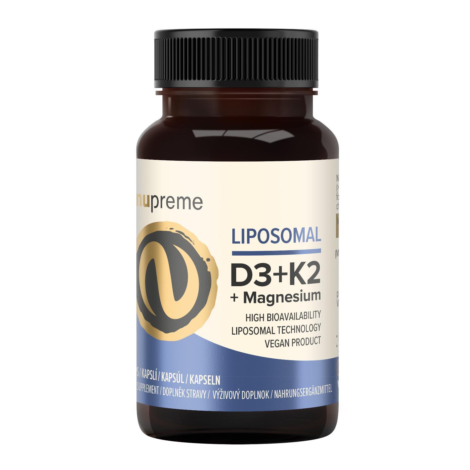Doplněk stravy od značky Nupreme obsahuje směs vitaminu D3, hořčíku (magnézium citrát) a vitaminu K2 (MK 7) ve vysoce vstřebatelné lipozomální formě.