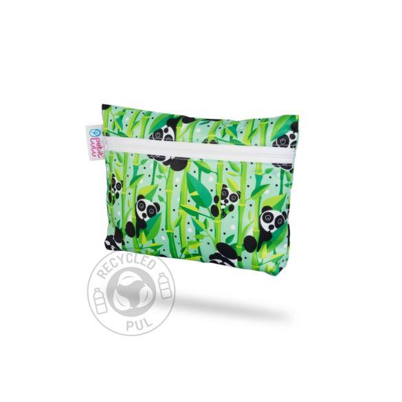 Malá taštička - velké možnosti! Taštička z nepromokavého recyklovaného PUL se vzorem medvídků panda se hodí na vložky do podprsenky, látkové vložky, roušky, ubrousky, ale třeba i na oblíbenou kosmetiku, nebo chutnou svačinku.