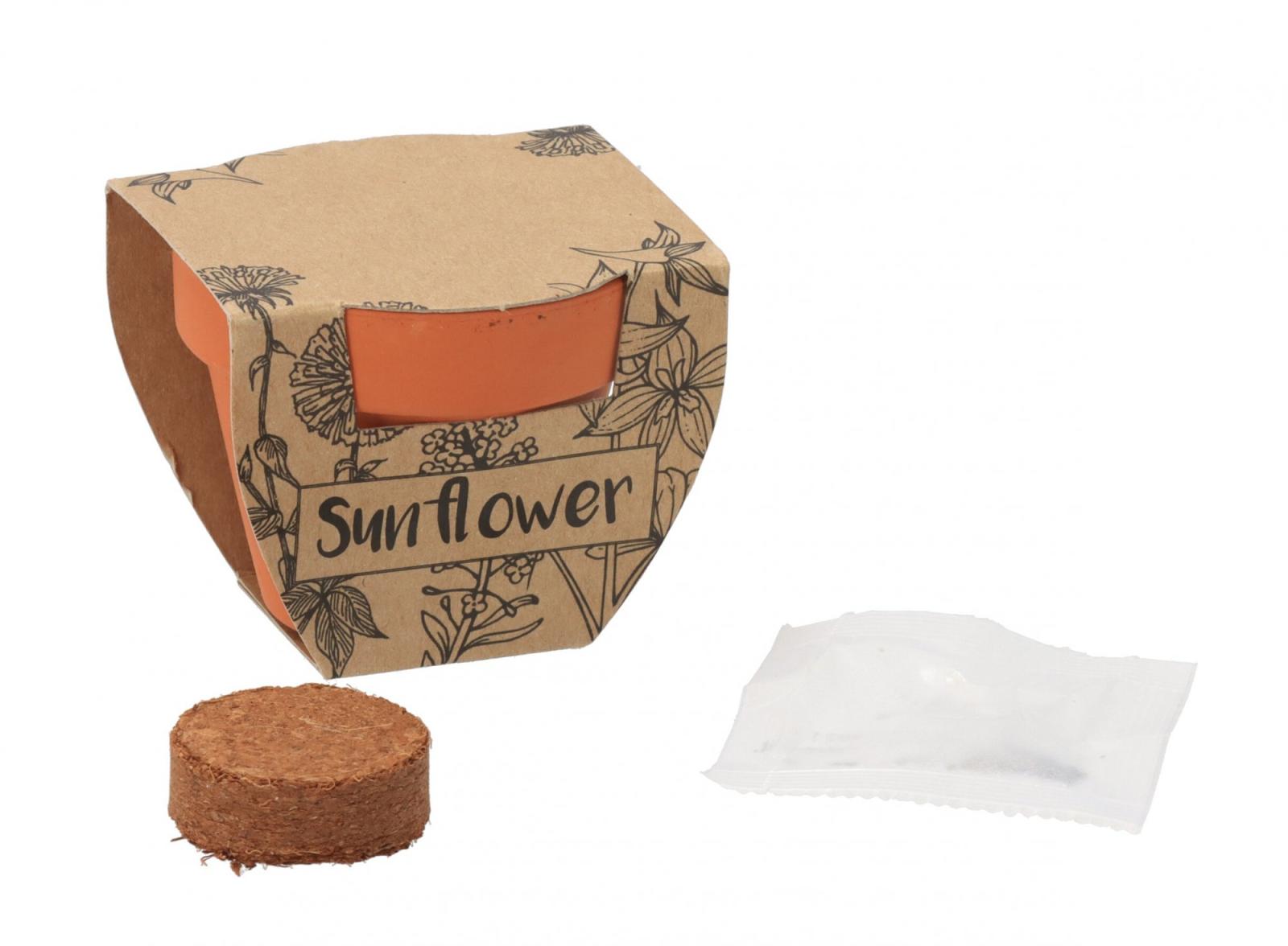 Slunečnice je jedna z nejcharakterističtějších květin, kterou si neustále spojujeme s létem a sluncem. Aby se květinám dařilo, potřebují sluneční záření. Nejlepší místa budou balkony a terasy, kde většinu dne kraluje slunce. Sada pro domácí pěstování slunečnice obsahuje vše potřebné, tedy malý terakotový květináč, dehydrovanou hlínu a semínka. Návod: vložte kolečko s hlínou do květináče a zalijte vodou cca 25-100 ml. Následně přidejte semínka a opět zalijte vodou.