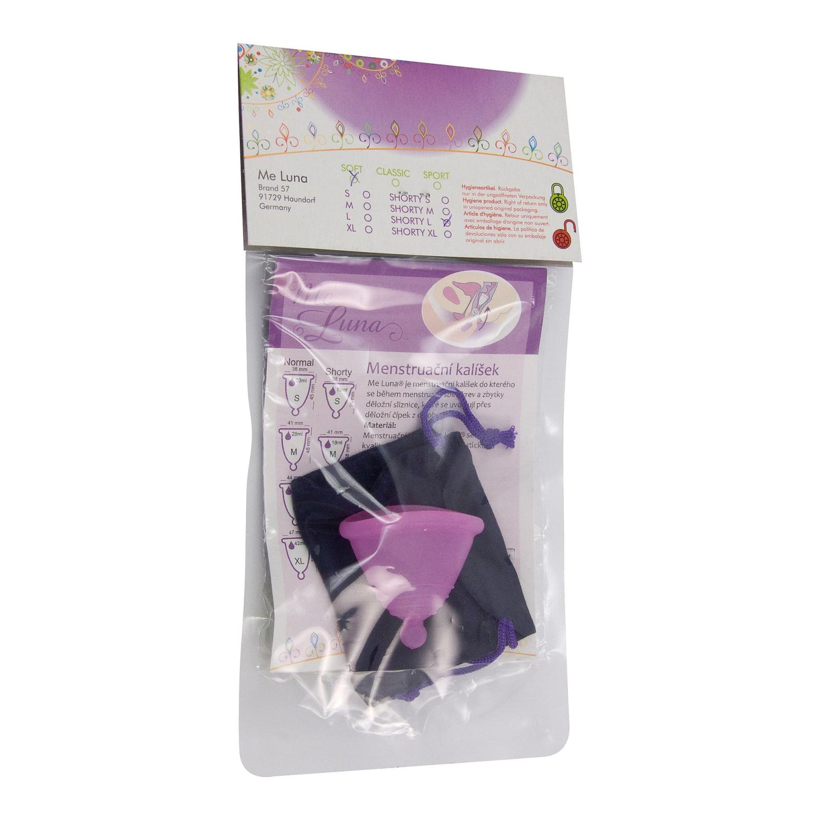 Kalíšek MeLuna Shorty ve velikosti M je nižší než ostatní druhy kalíšků MeLuna. Je 38 milimetrů vysoký, má průměr 41 mm a nabízí objem 11 ml. Je také měkčí než ostatní typy kalíšků této značky. Velikost M je vhodnou volbou pro ženy, které ještě nerodily a mají průměrně silnou menstruaci.