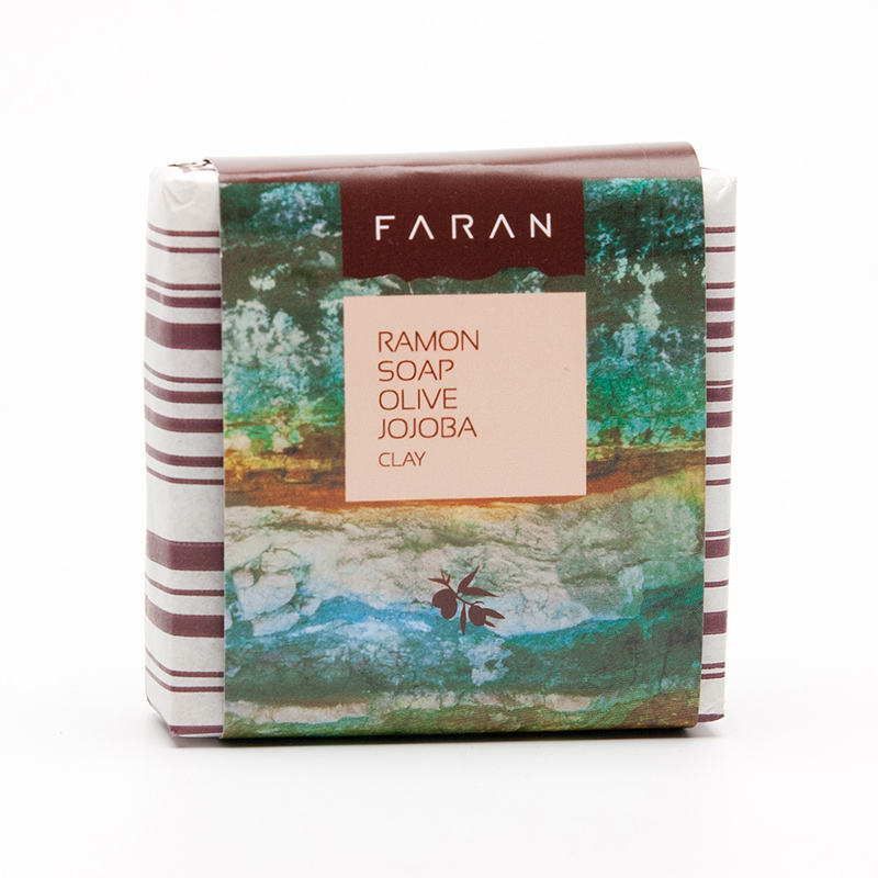 Výživné ručně vyráběné mýdlo Faran Ramon Soap Olive Jojoba Clay obsahuje olivový a jojobový olej spolu s izraelskou hlínou pro dokonale čistou pleť. Kaolín pochází z oblasti Ramonova kráteru a napomáhá hloubkovému čistění pleti. Mýdlo navíc obsahuje drť z olivových pecek, které jemně peelingují a obrušují pokožku.