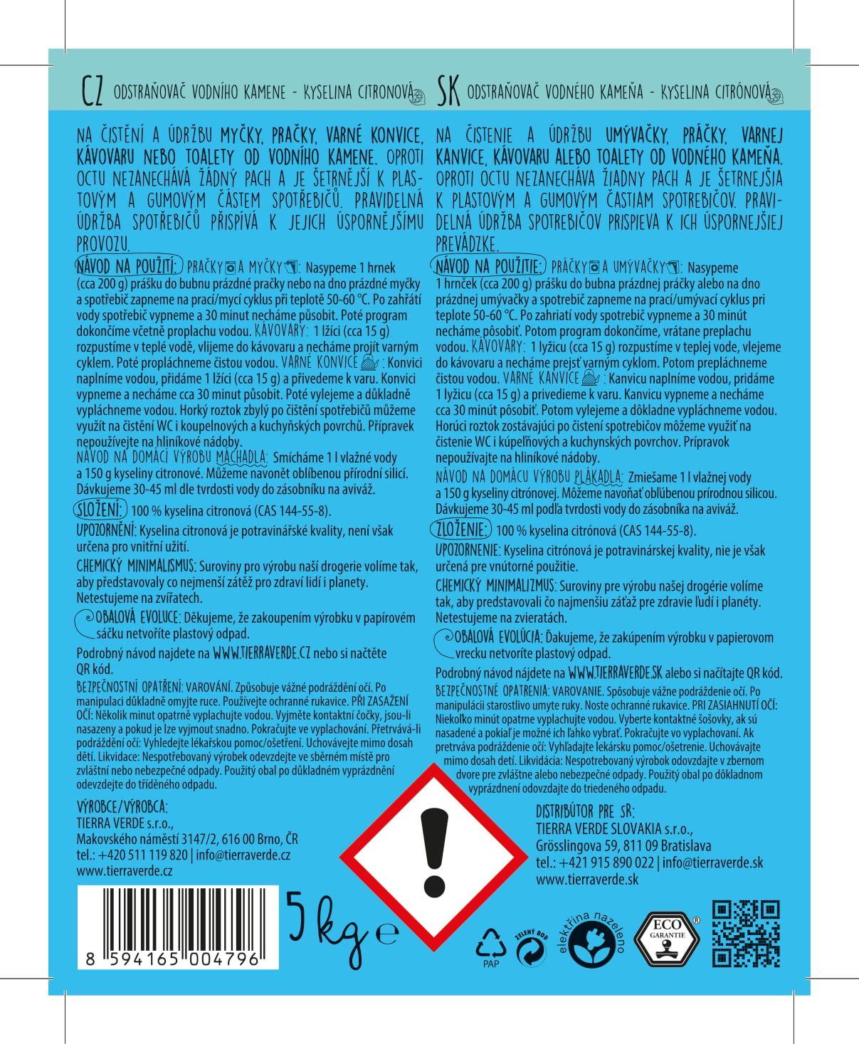 Použití: Pračky a myčky: Nasypeme 1 hrnek (cca 200 g) prášku do bubnu prázdné pračky nebo na dno prázdné myčky a spotřebič zapneme na prací/mycí cyklus při teplotě 50-60 °C. Po zahřátí vody spotřebič vypneme a 30 minut necháme působit. Poté program dokončíme včetně proplachu vodou. Kávovary: 1 lžíci (cca 15 g) rozpustíme v teplé vodě, vlijeme do kávovaru a necháme projít varným cyklem. Poté propláchneme čistou vodou. Varné konvice: Konvici naplníme vodou, přidáme 1 lžíci (cca 15 g) a přivedeme k varu. Konvici vypneme a necháme cca 30 minut působit. Poté vylejeme a důkladně vypláchneme vodou. Horký roztok zbylý po čištění spotřebičů můžeme využít na čistění WC i koupelnových a kuchyňských povrchů. Přípravek nepoužívejte na hliníkové nádoby. Návod na domácí výrobu máchadla: Smícháme 1 l vlažné vody a 150 g kyseliny citronové. Můžeme navonět oblíbenou přírodní silicí. Dávkujeme 30-45 ml dle tvrdosti vody do zásobníku na aviváž. Přípravek nepoužívejte k čistění hliníkových nádob.