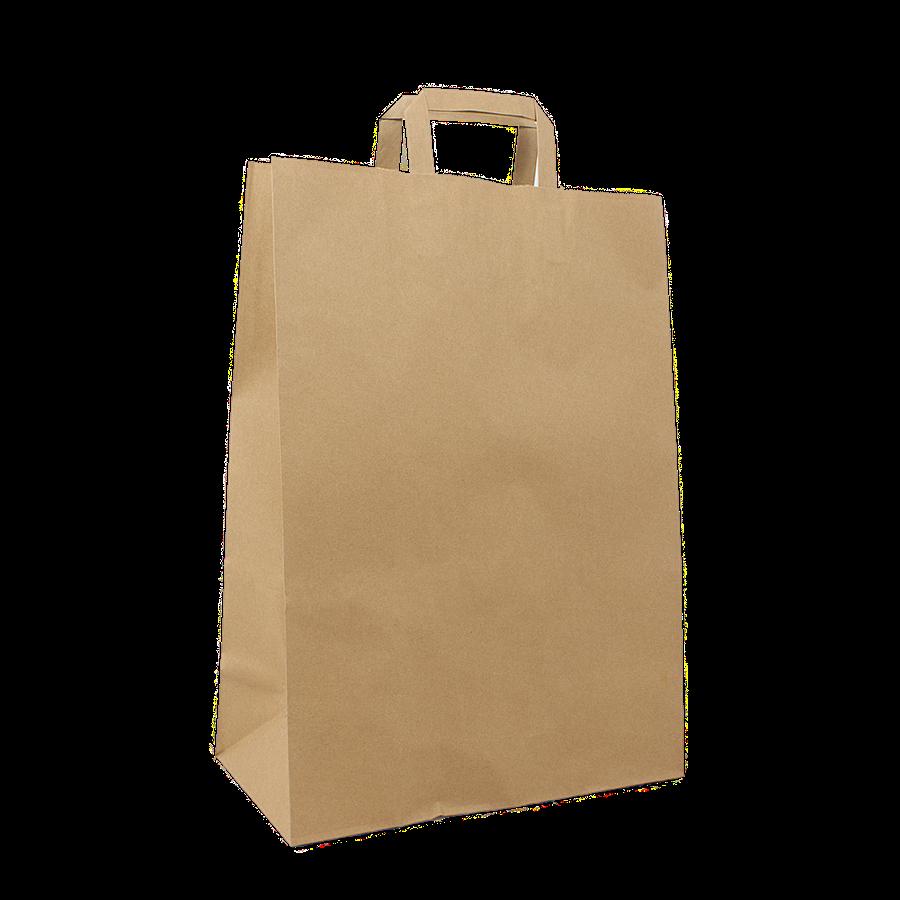 Papírová taška s plochým uchem 320+160 x 450 mm. Hnědé barvi. V balení naleznete 25 ks papírových tašek. Číst více...