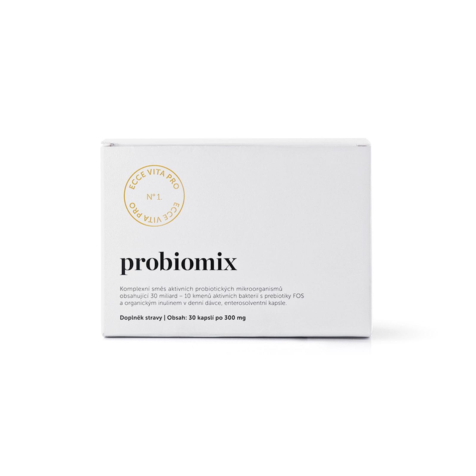 Probiomix od Ecce Vita obsahuje směs aktivních probiotických bakterií, prebiotik a inulinu. Rostlinné kapsle jsou pak vyrobené tak, aby odolaly působení žaludečních kyselin, a rozpustily se tak až v místě určení (střeva). Probiotika a prebiotika je vhodné doplňovat při braní antibiotik, ale můžete je užívat i preventivně.